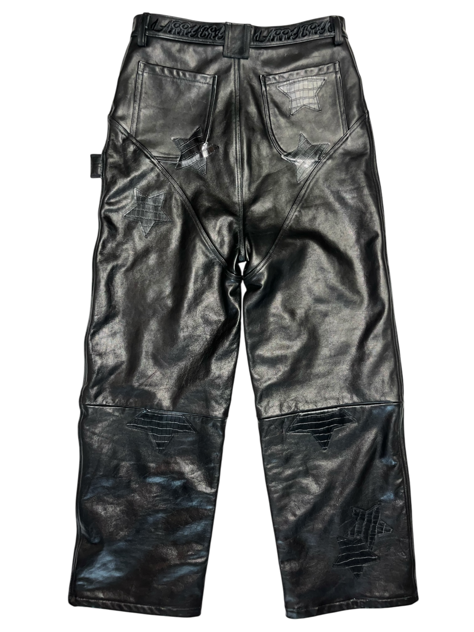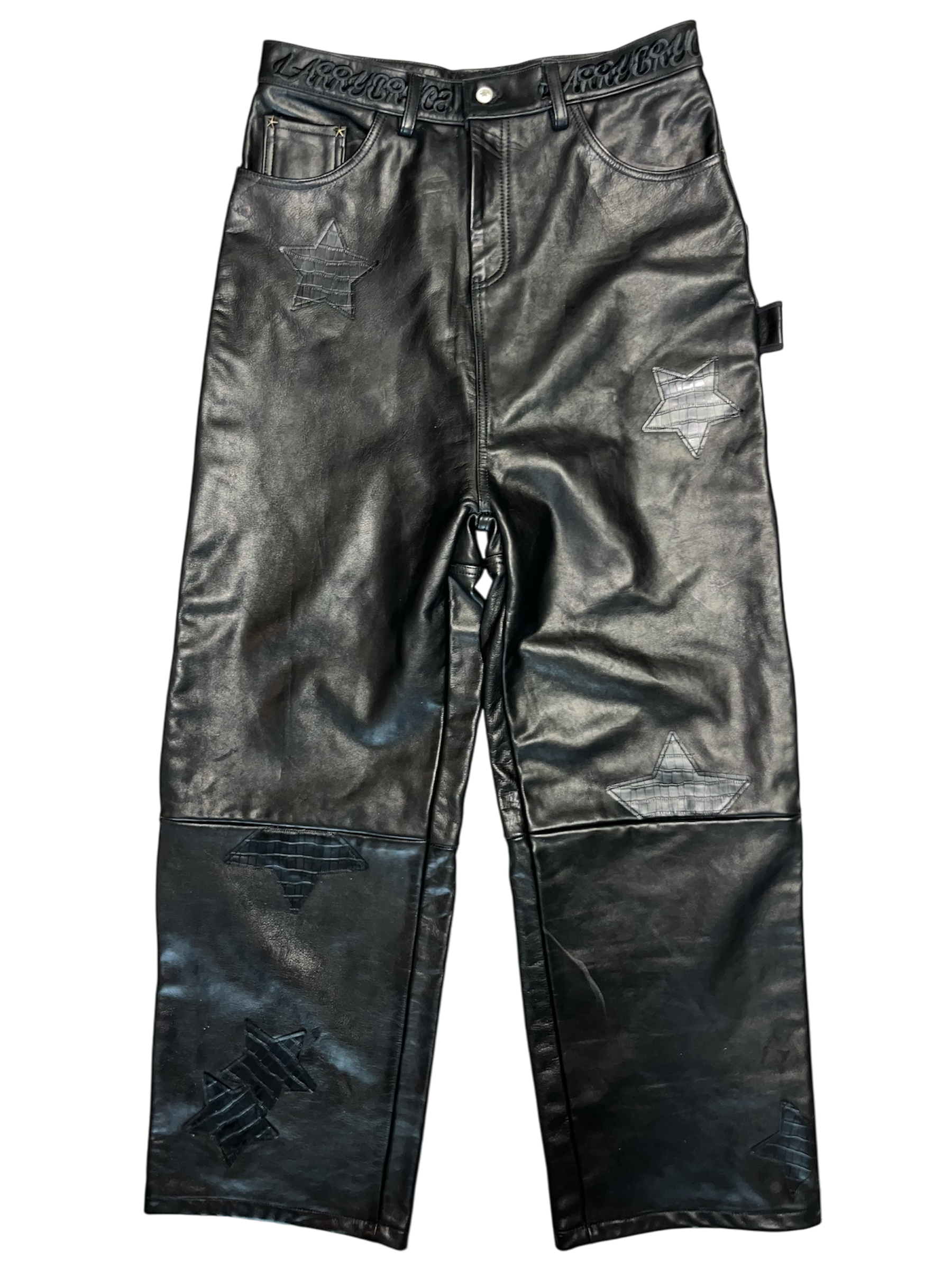 Made from real cowhide, they’re cut with a baggy, true-to-size fit — comfortable, confident, and bold. Alligator star patches bring a sharp edge, a mix of heritage and high style. Star-shaped rivets add subtle detail, while the custom button stamped with “TEXAS” and a lone star grounds the piece in its root and at the waist, Larrybryce, embroidered.